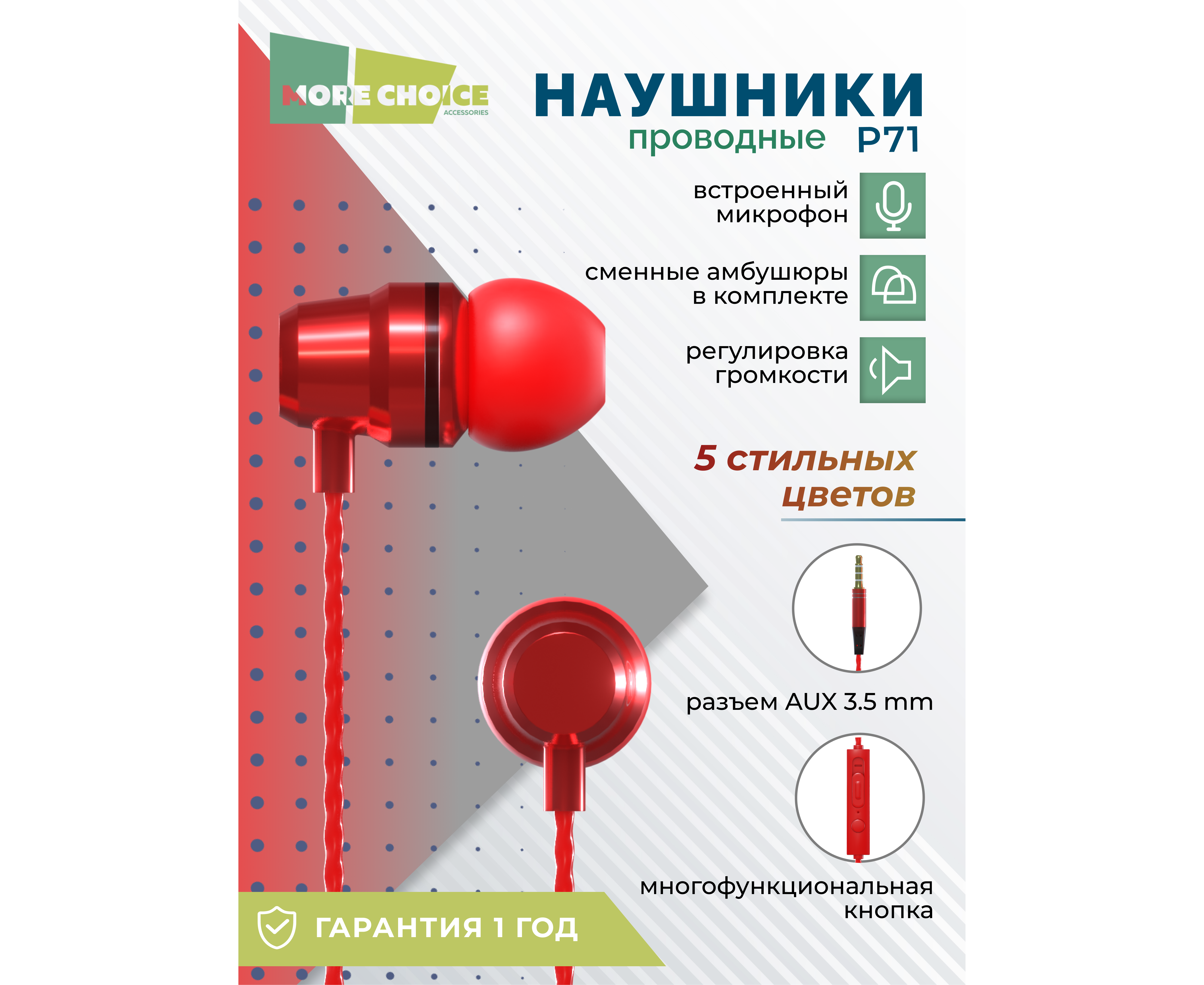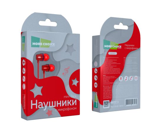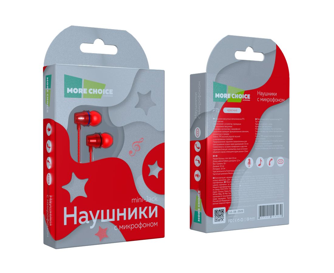 Наушники вакуумные AUX разъём с МК и рег.громкости длина 1.2м More Choice P71 (Red)