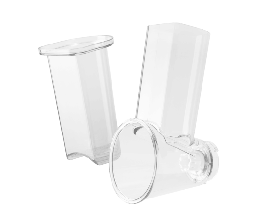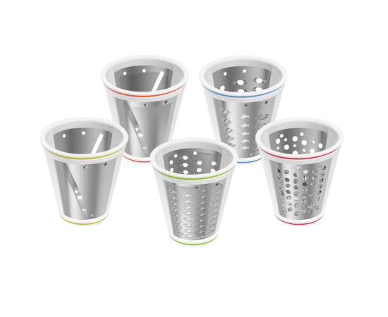 Комплектация 3 терочных (крупная терка, средняя терка, мелкая терка) и 2 шинковочных ножа (крупная шинковка, мелкая шинковка), толкатель