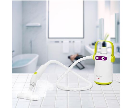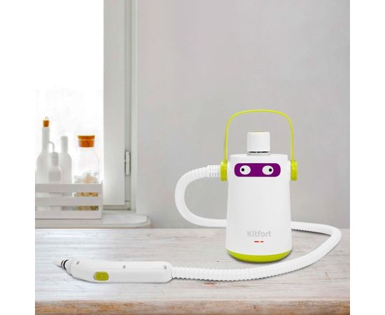 Пароочиститель KITFORT КТ-9109-2 бело-салатовый способен заменить дезинфектор, стеклоочиститель и отпариватель для тканей. Главное преимущество пароочистителя — прибор безопасен для здоровья человека и не приносит вреда окружающей среде.