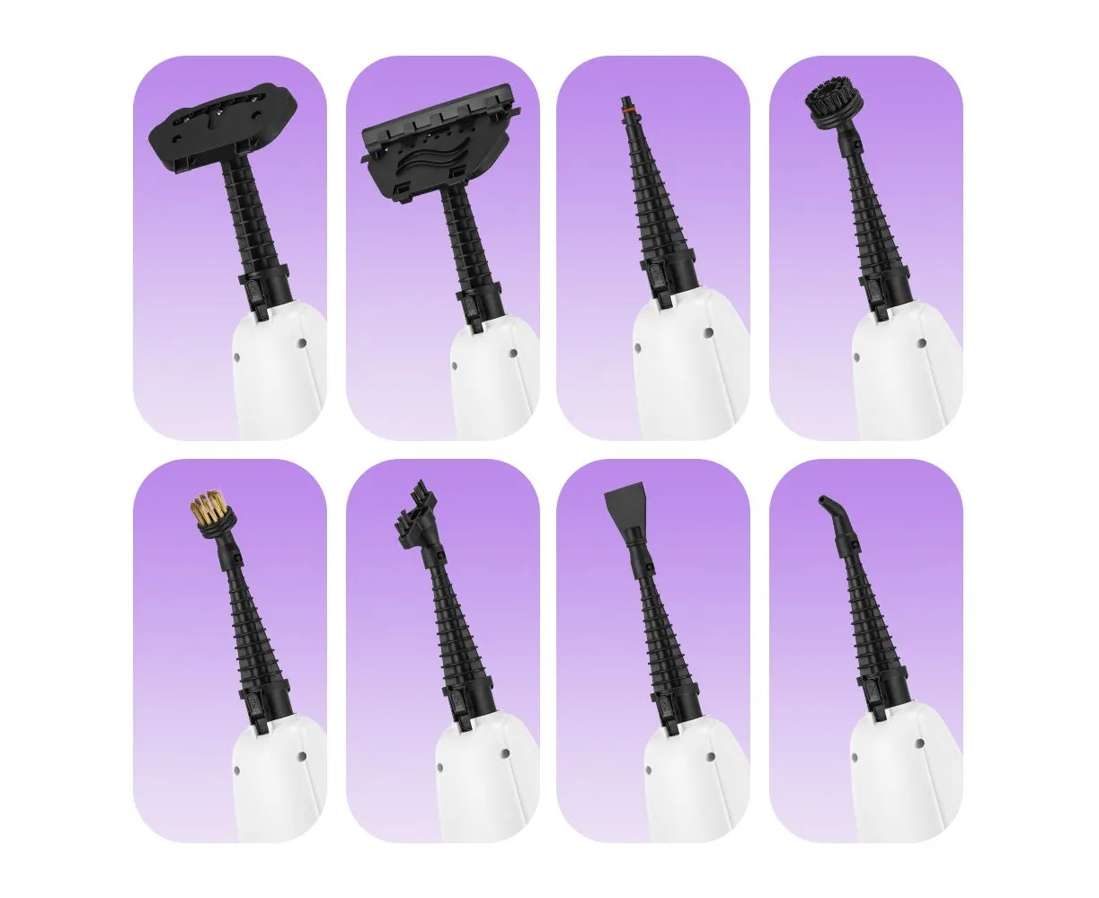 При помощи восьми специальных насадок из комплекта КТ-3917 очистит напольные покрытия, раковину и плиту на кухне, зеркала, окна и плитку в ванной без каких-либо химических средств, исключительно паром.
