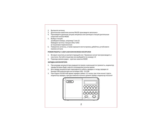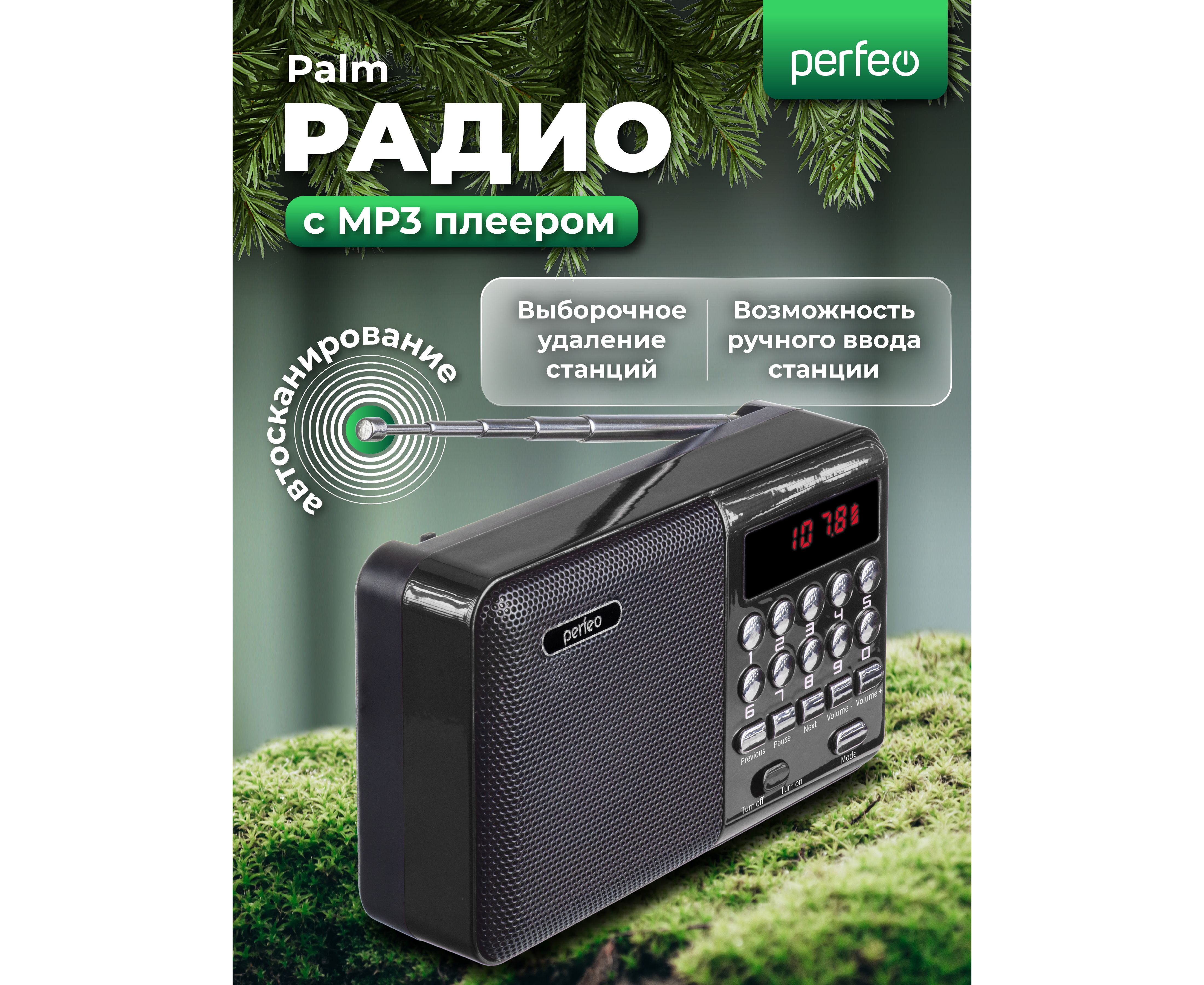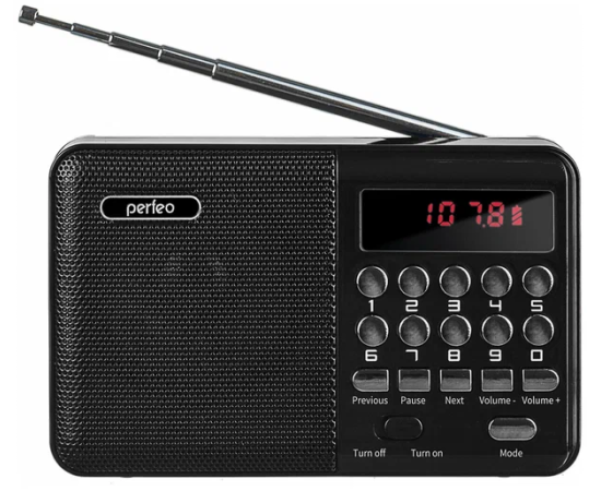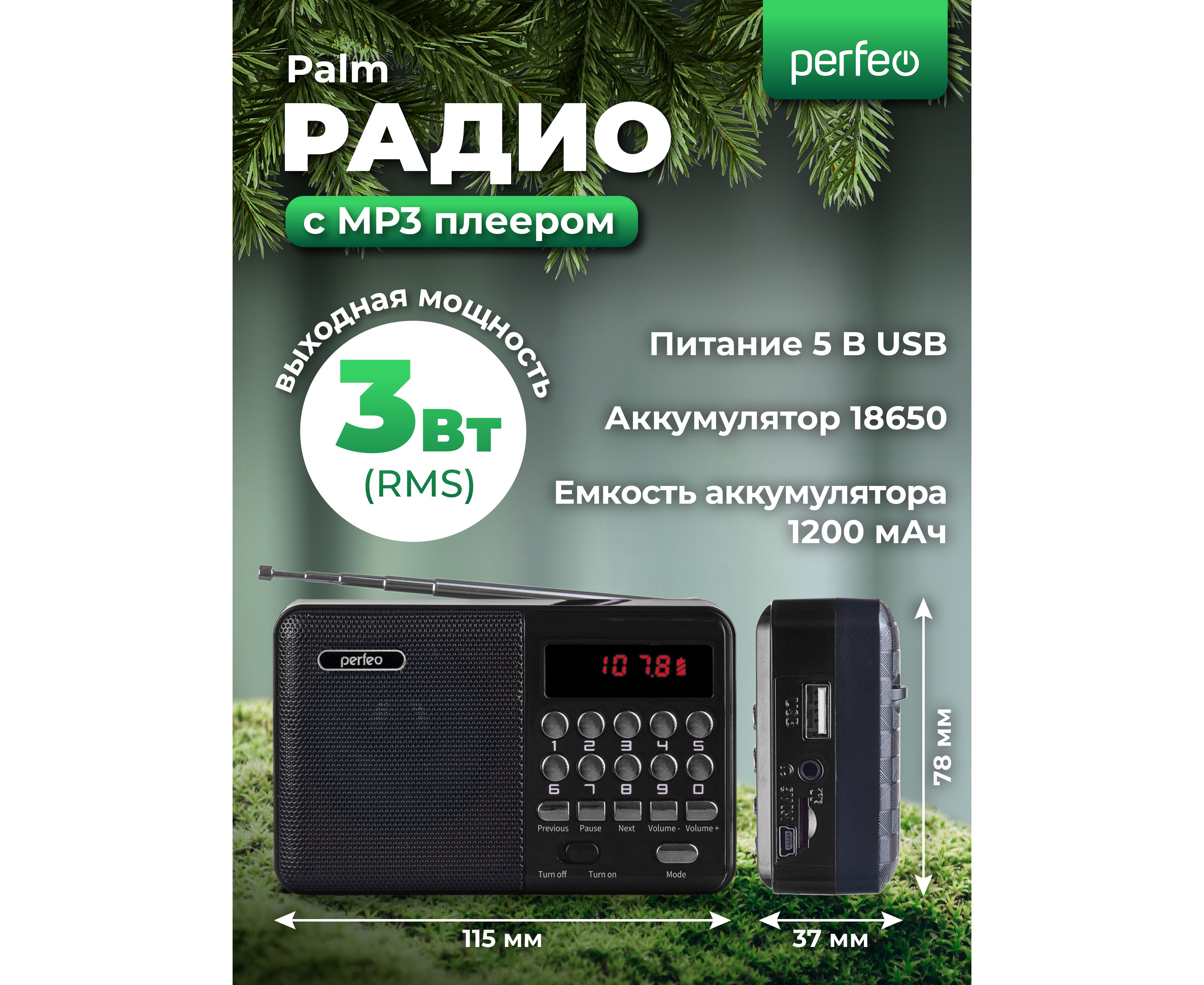 Радиоприемник цифровой Perfeo PALM (i90). Радио с расширенным функционалом умеет воспроизводит MP3-файлы с карт памяти и USB-флэшек. Приемник может работать не только от аккумуляторов (18650), но и от адаптера для зарядки (в комплект не входит) подключенного в сеть 220В. Радиоприемник от сети имеет встроенное цифровой тюнер FM (87,5 – 108 МГц) с автоматическим поиском станций. Радио оснащено поворотной телескопической антенной, возможность воспроизведения музыки с USB flash и microSD карт памяти, вход AUX для подключения источника звука. LED-дисплеем (отображает номера mp3-треков и частоту радиостанции). В комплекте идет кабель miniUSB для зарядки радиоприемника. Радиоприемник мини компактного размера удобно переносить, он помещается в карман. Это радио на аккумуляторе можно слушать даже ночью и не беспокоится, что можно кого-то разбудить, ведь у колонки с радио есть разъем для наушников. Радио PALM – отличный попутчик для поездок, путешествий и прогулок. Радиоприемник от сети и аккумулятора - легкий, удобный, компактный и многофункциональный, не займет много места и не оставит вас без любимой музыки. В нашем ассортименте магазина Perfeo есть множество портативных радиоприемников, они станут отличным подарком для родителей, дедушек и бабушек, подарят хорошее настроение и станут украшением вашего интерьера, прекрасно впишутся в любой дизайн, как дома, так и на даче, незаменимы в походе. Радиоприемник легко зарядить от повербанка, он не прихотлив в использовании.