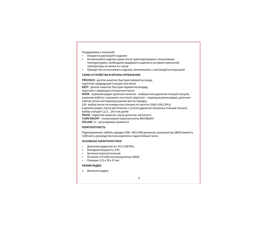 Комплектация 1 шт руководство пользователя; Радиоприемник 1 шт; USB кабель Mini USB - 1 шт