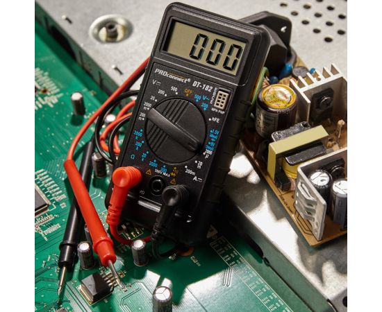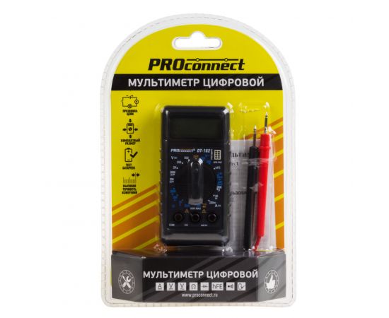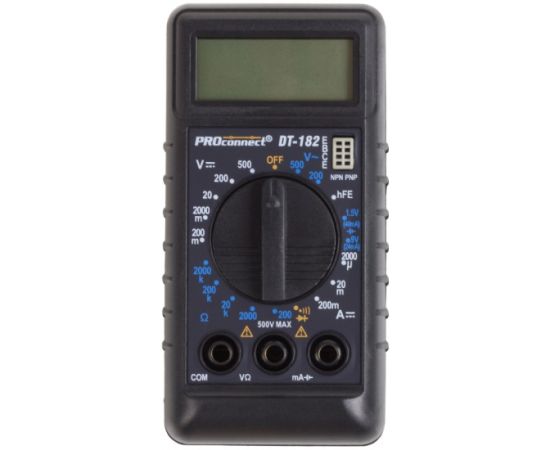 Мульти́метр — электроизмерительный прибор, который включает в себя несколько функций и набор измеряемых параметров. Цифровой портативный мультиметр PROconnect DT-182 представляет собой субкомпактный 3,5-разрядный прибор, предназначенный для измерения постоянного и переменного напряжения, постоянного тока, сопротивления, проверки диодов, транзисторов, прозвонки соединений, а также проверки батареек. Самый компактный из приборов PROconnect.