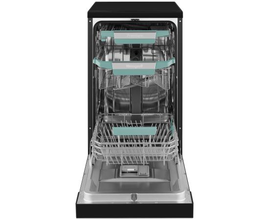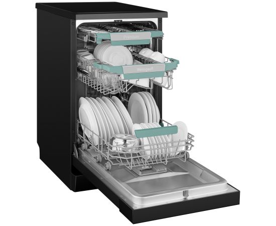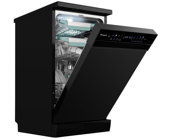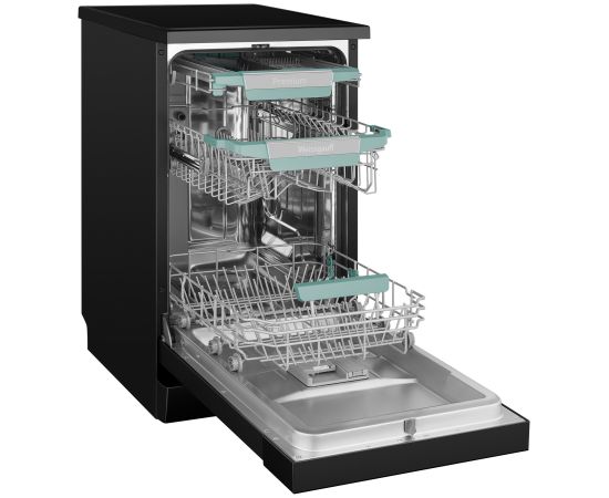 Узкая отдельностоящая посудомоечная машина Weissgauff c корпусом, выполненным в черном цвете с инновационным цветным дисплем SMART SCREEN с сенсорным управлением, инверторным двигателем и функцией автоматического открытия дверцы, не только сэкономит место на вашей кухне, но и обеспечит идеальный результат: 3 корзины позволят расположить посуду оптимальным образом для достижения наилучшего качества мытья, а вместимость посуды до 10 комплектов - это не только экономия места на кухне, но и отличное качество мытья вашей посуды.