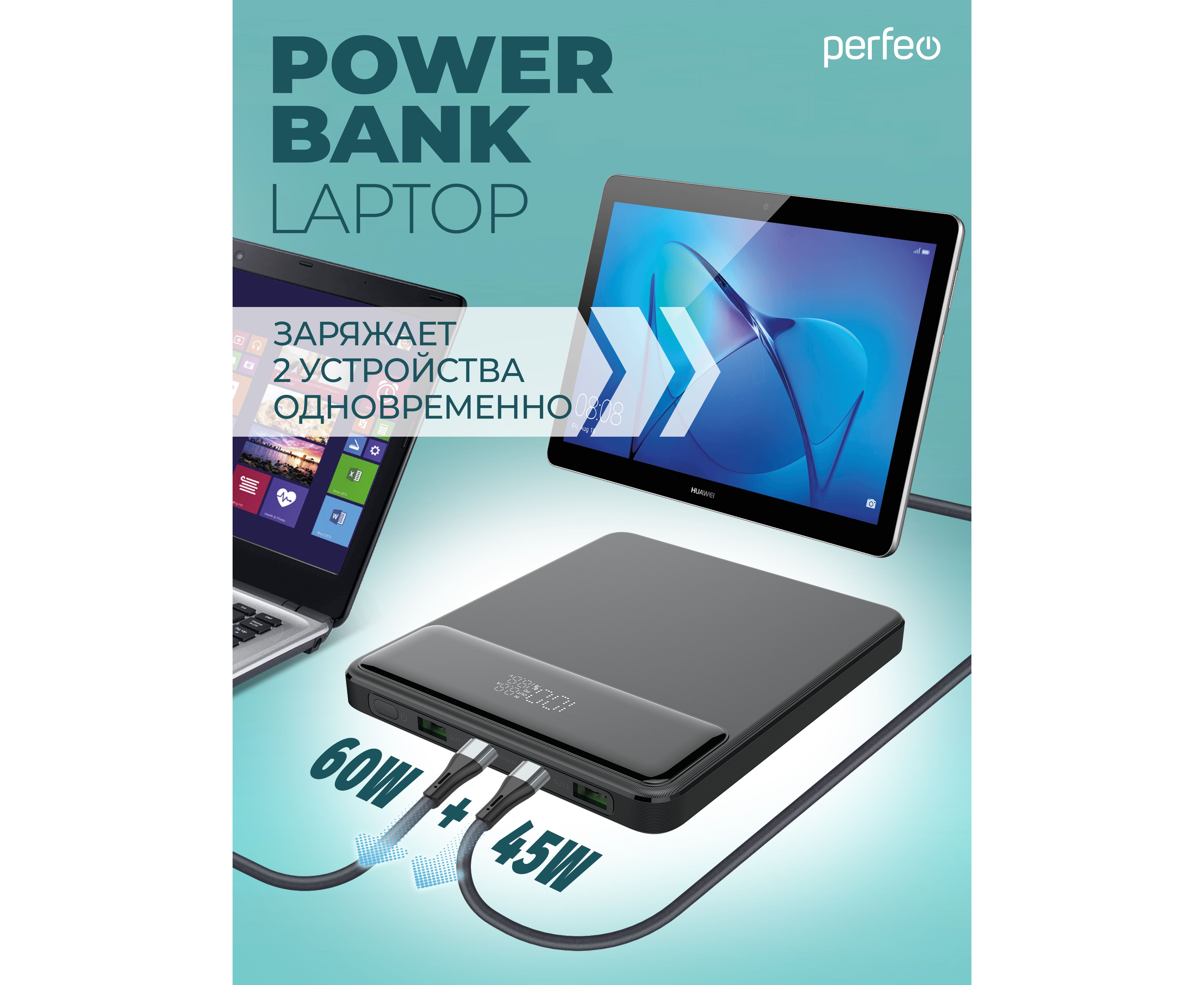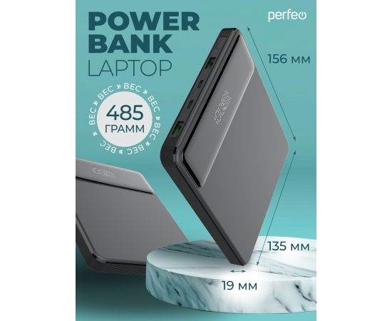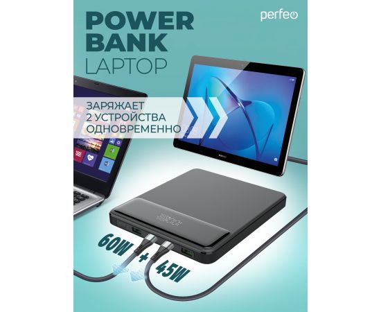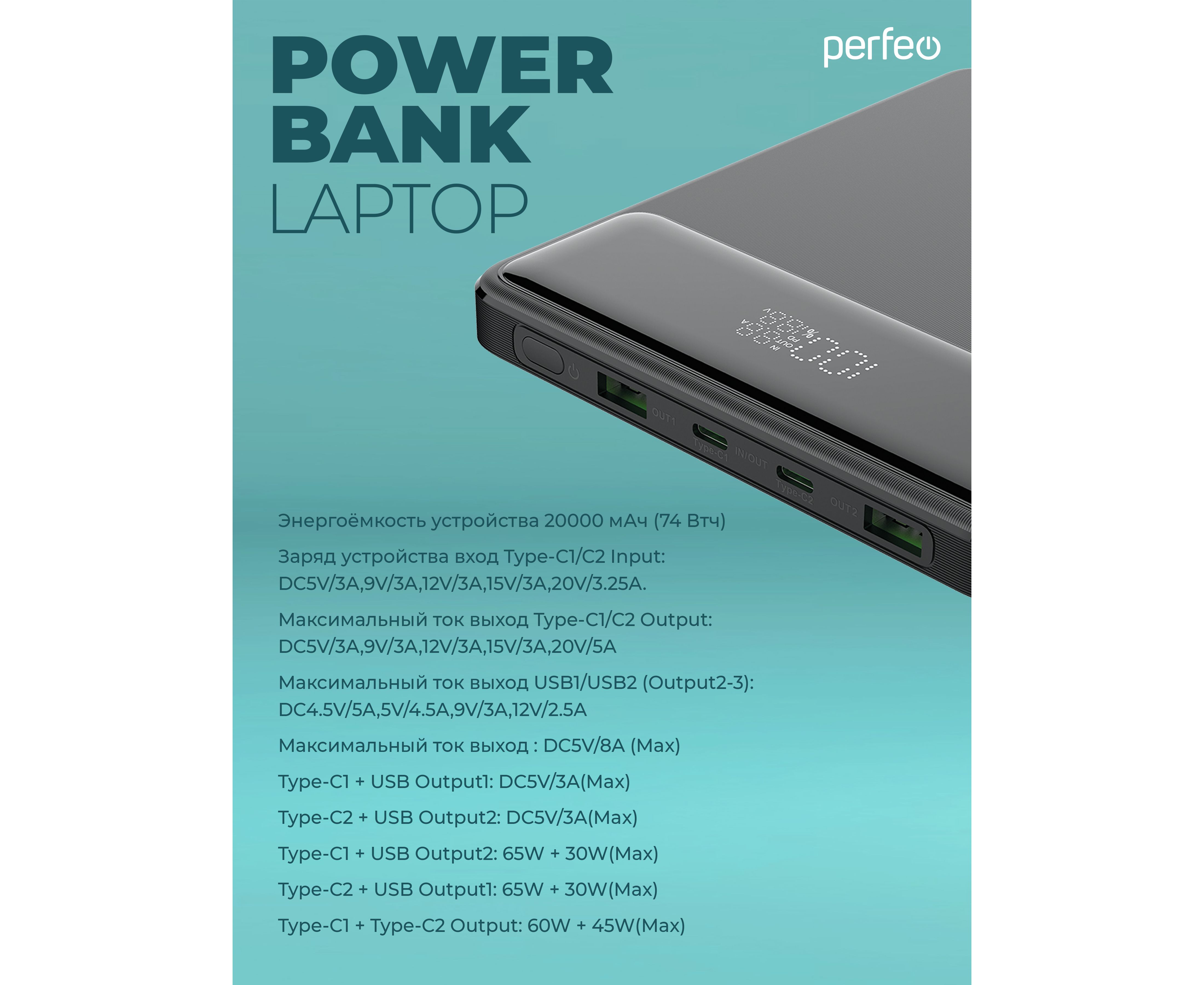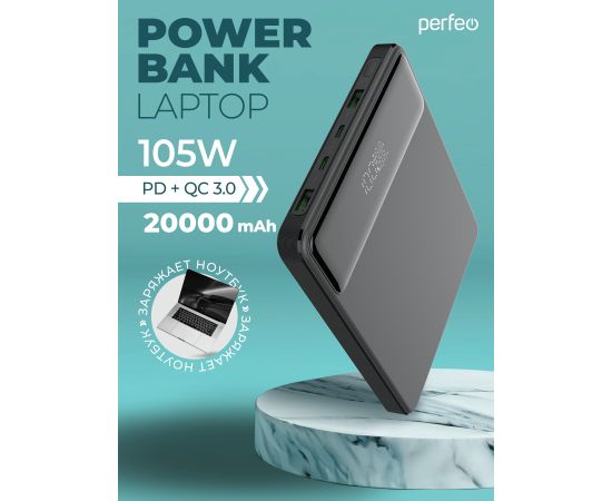 Повербанк для Ноутбука! Perfeo LAPTOP 105W 20000 mAh/LED дисплей/PD + QC 3.0/2 Type-C/2USB/Выход: 5A,max105W, Черный, (Арт. PF_E1472)
