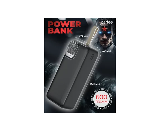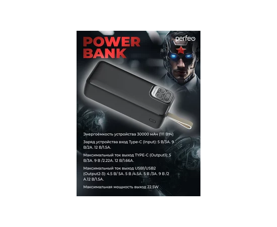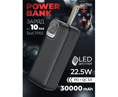 Повербанк Perfeo Atomic Age 30000 mAh/LED дисплей/PD + QC 3.0/Type-C/2 USB/Выход: 5A, max 22.5W/ Черный, (Арт. PF_E1478)