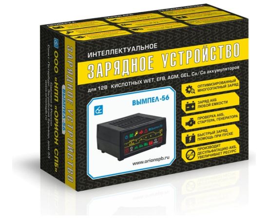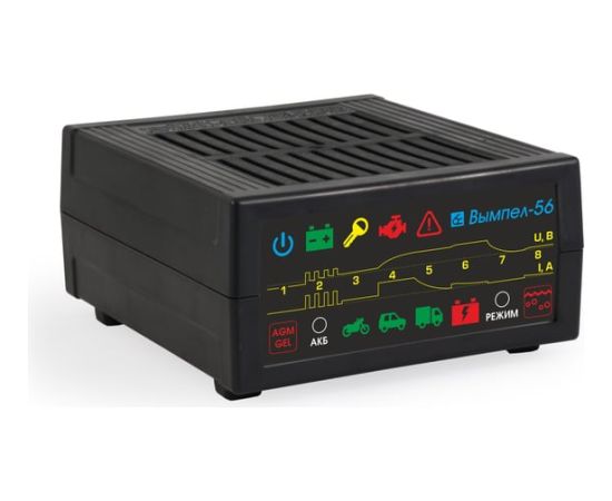 Интеллектуальное зарядное устройство Вымпел- 56, с диагностикой АКБ, стартера, генератора, 20А/ 2104 предусматривает возможность диагностики АКБ, проверки генератора и проведения стартерного теста. Подходит для заряда стартерных и тяговых кислотных 12 В АКБ любой емкости, стандартных WET, EFB, Ca/Ca с напряжением в конце заряда 14,8 В, а также AGM и GEL аккумуляторов с напряжением в конце заряда 14,1 В.