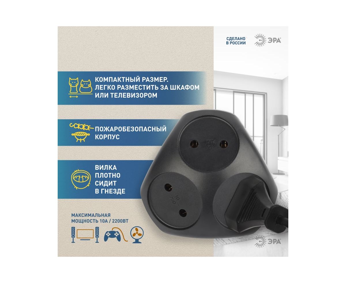 Сетевой разветвитель (тройник) ЭРА SPx-3-B на 3розетки, без заземления. Цвет-черный. Максимальная мощность - 10А/2200 Вт, материал корпуса - полипропилен (пластик премиум сегмента). Эксклюзивный продакт-дизайн.