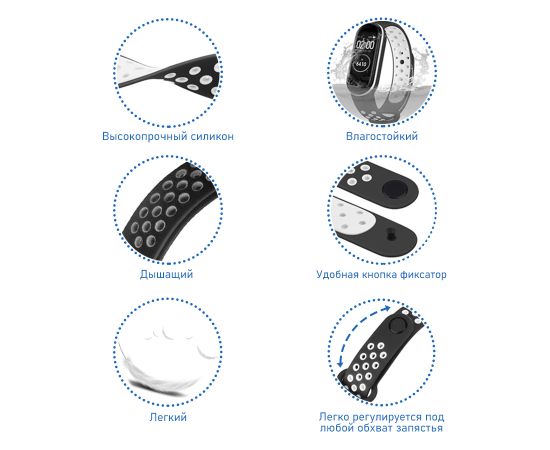 Силиконовый перфорированный ремешок Sport NK от Great Case для Xiaomi Mi Band с инновационной кнопочной застежкой - это аксессуар, который специально создан, чтобы выдерживать натиск активного образа жизни и при этом сохранять стильный внешний вид. Сочетание гибкости и прочности силиконовой основы с тщательно продуманной перфорацией делает этот ремешок идеальным для всех, кто занимается спортом, ведет активный образ жизни или просто предпочитает комфорт в повседневной носке. Отверстия не только способствуют лучшей вентиляции и снижению веса ремешка, но и придают ему уникальный, ярко выраженный вид, который привлекает внимание и делает аксессуар заметным дополнением к вашему стилю.Кнопочная застежка добавляет элемент быстроты и простоты в процессе крепления ремешка, позволяя с легкостью настроить его по размеру и плотности прилегания к запястью. Этот ремешок - не только удобный и практичный выбор, но и отражение заботы о собственном удобстве и внешнем виде.