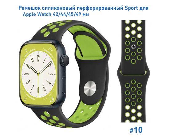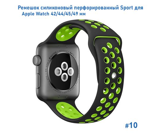 Ремешок силиконовый перфорированный Great Case Sport NK для Apple Watch 42/44/45/49 мм, 235мм, на кнопке, черный+зеленый (10)