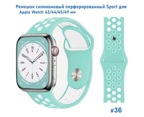 Ремешок силиконовый перфорированный Great Case Sport NK для Apple Watch 42/44/45/49 мм, 235мм, на кнопке, бледно-бирюзовый+белый (36)