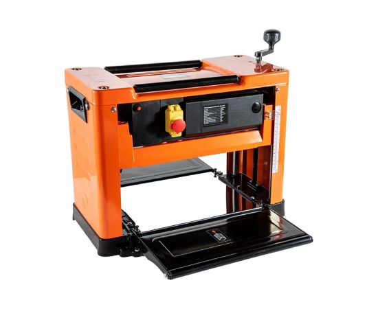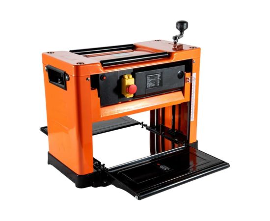 Безопасность работы обеспечивается многосекционной зубчатой защитой от обратного удара при рейсмусовании по всей рабочей ширине станка. Автоматическая подача заготовки со скоростью 8,5 метров в минуту увеличивает производительность труда, процесс обработки осуществляется значительно быстрее. Два ножа из быстрорежущей стали вращаются со скоростью 8000 об/мин, что гарантирует высокое качество обработки.