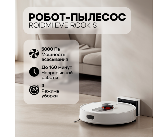 Roidmi Robot Vacuum and Mop Cleaner EVE ROOK S — это робот-пылесос, который предназначен для автоматической уборки помещений. Он оснащён различными функциями и технологиями, которые позволяют ему эффективно очищать различные типы поверхностей от пыли, мусора и других загрязнений.