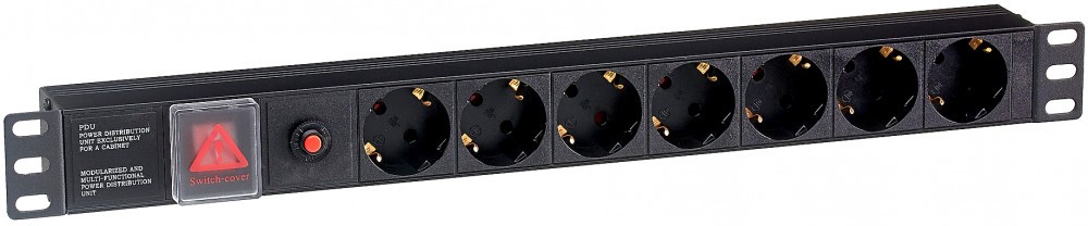 горизонтальный блок розеток, входной разъём: IEC 320 C14, розетки: 7x Schuko, макс. ток нагрузки 10A, автоматический выключатель, выключатель с подсветкой, стандарт EAC