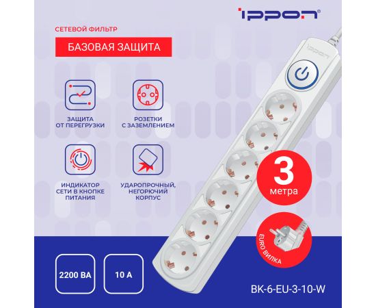 Сетевой фильтр Ippon BK-6-EU-3-10-W (3м 6 розеток белый)
