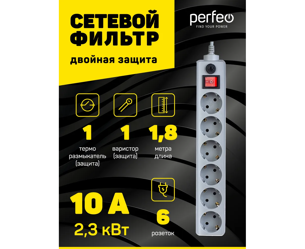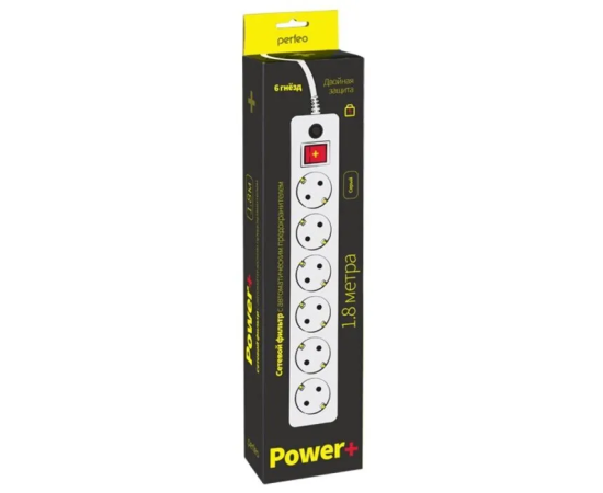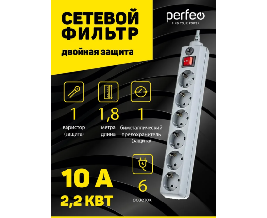 Сетевой фильтр Perfeo "POWER+", 1,8м, 6 розеток, (PF-PP-6/1,8-G), серый