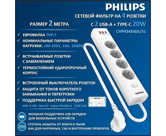 Сетевой фильтр Philips CHP4346WA/51 2м (4 розетки) белый (коробка)