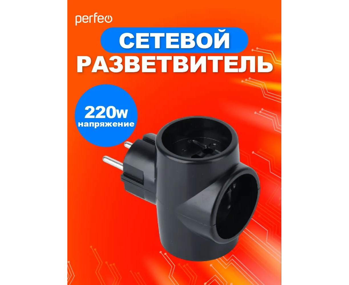 Сетевой разветвитель Perfeo "RU POWER'' 3 гнезда, 6А, без заземления, (3Т), черный