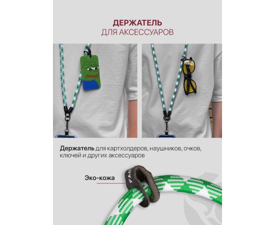 - Регулируемая длина. Шнурок можно носить разными способами: на шее, через плечо, на руке, на запястье или как кросс боди для телефона. Длина регулируется при помощи петли для аксессуаров.