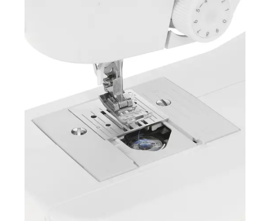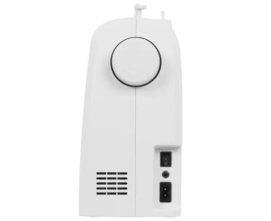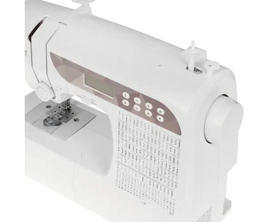 Оборудование представлено в настольном белом корпусе с дисплеем, рукавной платформой, отсеком для аксессуаров и горизонтальным челноком. Устройство работает от стандартной электросети, а поставляется с набором шпулек, лапок и игл, отверткой, масленкой, распарывателем и пластиной для штопки/вышивки. Прибор весит 5.5 кг и обладает размерами 37.8x30.8x14 см.