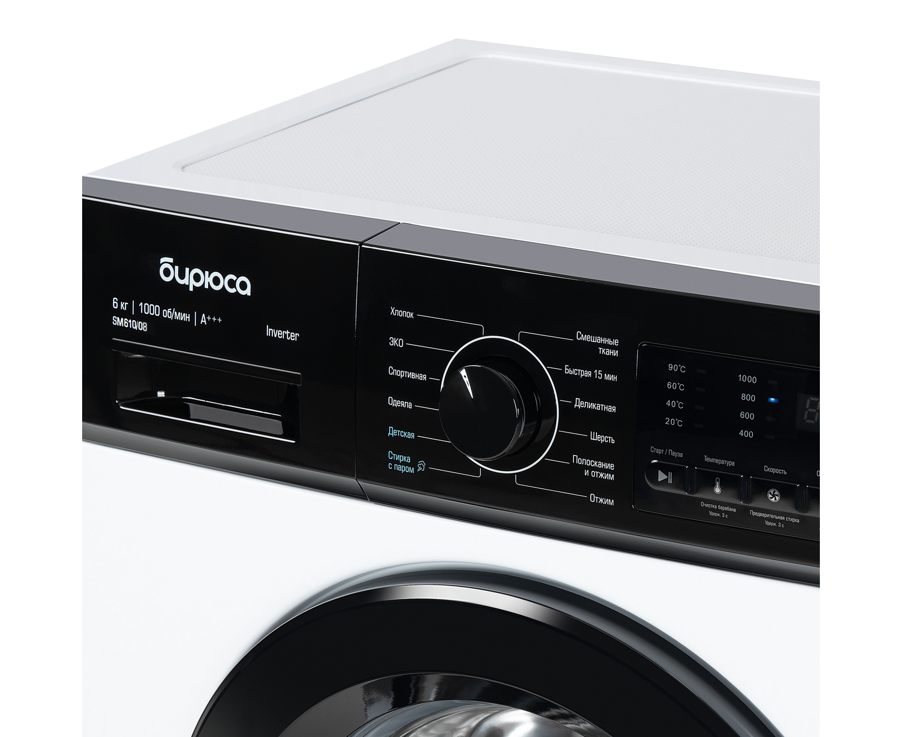 Основные программы Хлопок, Деликатная, Шерсть, Смешанные ткани, Быстрая 15 мин, Отжим, Полоскание и отжим