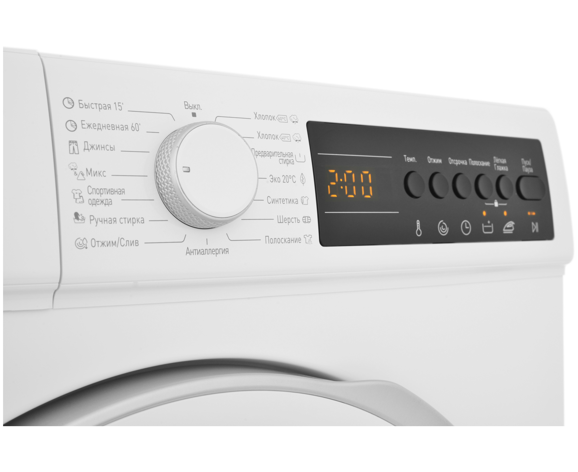 выбор скорости отжима, выбор температуры стирки, контроль баланса, контроль за уровнем пены, отложенный старт