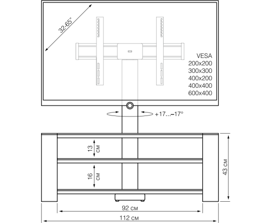 угол наклона 10°, угол поворота 17°, встроенный кабель-канал, максимальная нагрузка на полку 15 кг
