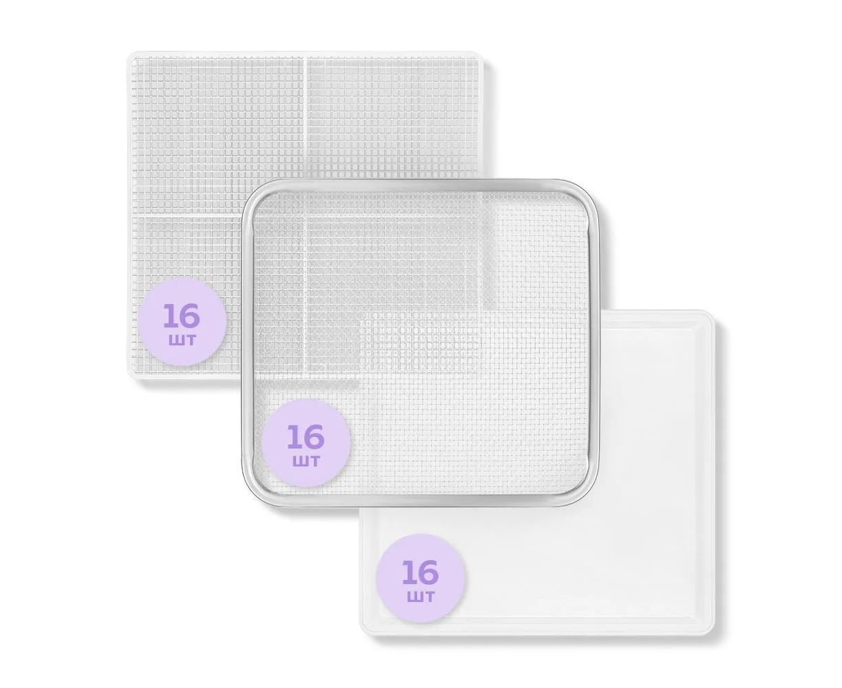 В комплект к аппарату входят разные сетки и поддоны. Металлические поддоны − для большинства типов продуктов. Сетки − для небольших продуктов, таких как травы и ягоды. Сплошные поддоны − для приготовления пастилы и сушки водянистых фруктов и овощей.