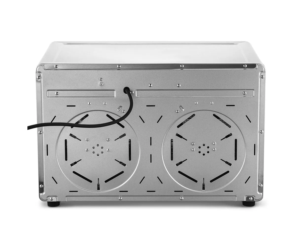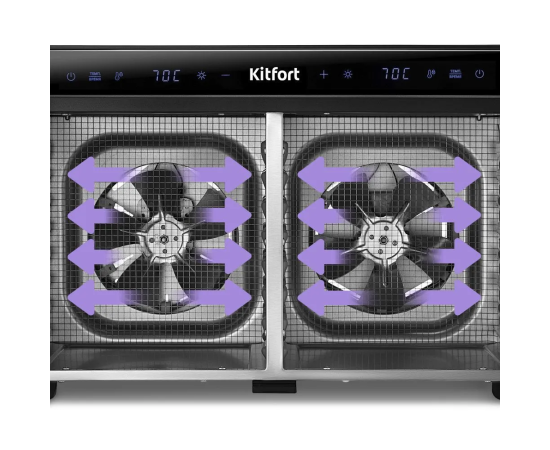 В сушилку установлены мощные нагревательные элементы и два вентилятора, обеспечивающих равномерное распределение воздуха по всему объёму камер. Благодаря горизонтальному обдуву смешение запахов при одновременной сушке разных продуктов минимально.