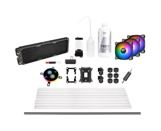 комплект включает в себя 2 вентилятора Pure 12 ARGB Sync Radiator Fan, водоблок на процессор Pacific W4 ARGB, совмещенную помпу с резервуаром Pacific PR15-DDC, медный радиатор Pacific C360, литровую бутылку прозрачного хладагента T1000, 6 фитингов C-Pro G14 PETG 16mm OD, 8 жестких трубок V-Tubler PETG, контроллер подсветки ARGB LED controller и другие аксессуары