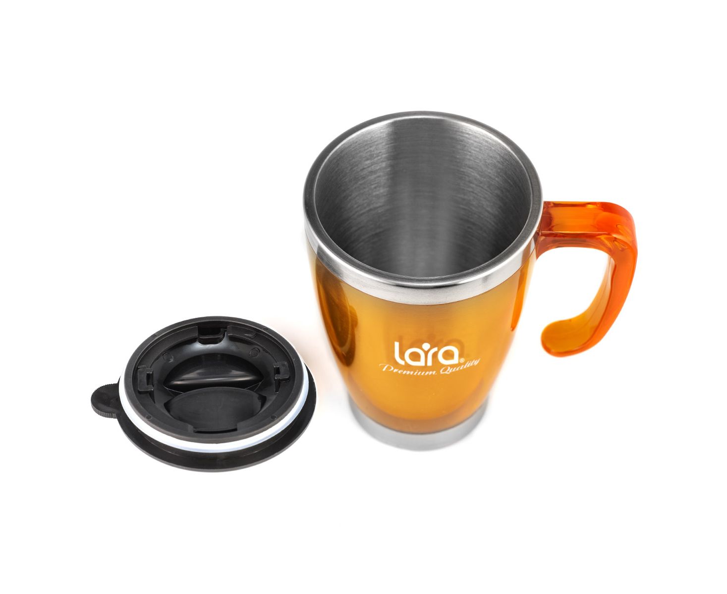 Удобная и яркая термокружка LARA LR04-38 с ручкой подходит для горячих и холодных напитков. Благодаря двойным стенкам напиток дольше сохраняет температуру. Конструкция крышки позволяет без труда снять ее с кружки. Колба изготовлена из нержавеющей стали.