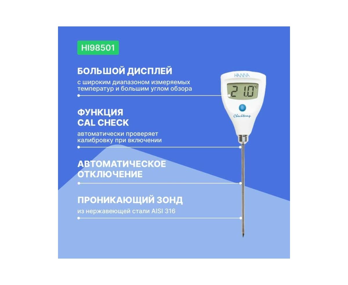 Карманный термометр HANNA instruments HI98501 Checktemp HI 98501 позволяет измерять температуру сыпучей, твердой, жидкой и газообразной среды.
