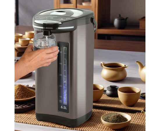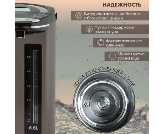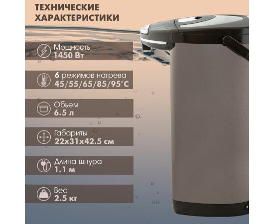 Два способа подачи воды: автоматический, касанием чашки, 6 режимов температуры нагрева воды: 45 /55 / 65 / 85 / 95°C + температура окружающей среды, Функция поддержания температуры, Функция повторного кипячения, Индикатор уровня воды, Блокировка включения без воды и блокировка крышки, Материал колбы: нержавеющая сталь, Тип нагревательного элемента: закрытый, Съемная крышка, Вращение на основании на 360°, Удобная ручка для переноски
