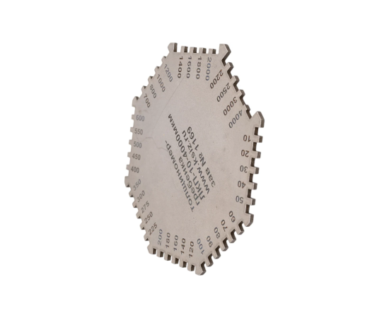 Толщиномер-гребенка предназначен для измерения толщины не отвердевших покрытий на плоских и цилиндрических изделиях. Толщиномер-гребенка имеет две опорные базы на каждой из граней и набор выступов с фиксированным зазором относительно баз. За толщину покрытия принимается величина зазора между опорной базой и между значениями толщины, мкм, указанными на паре окрашенного и неокрашенного выступов.