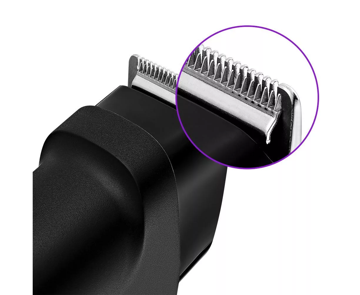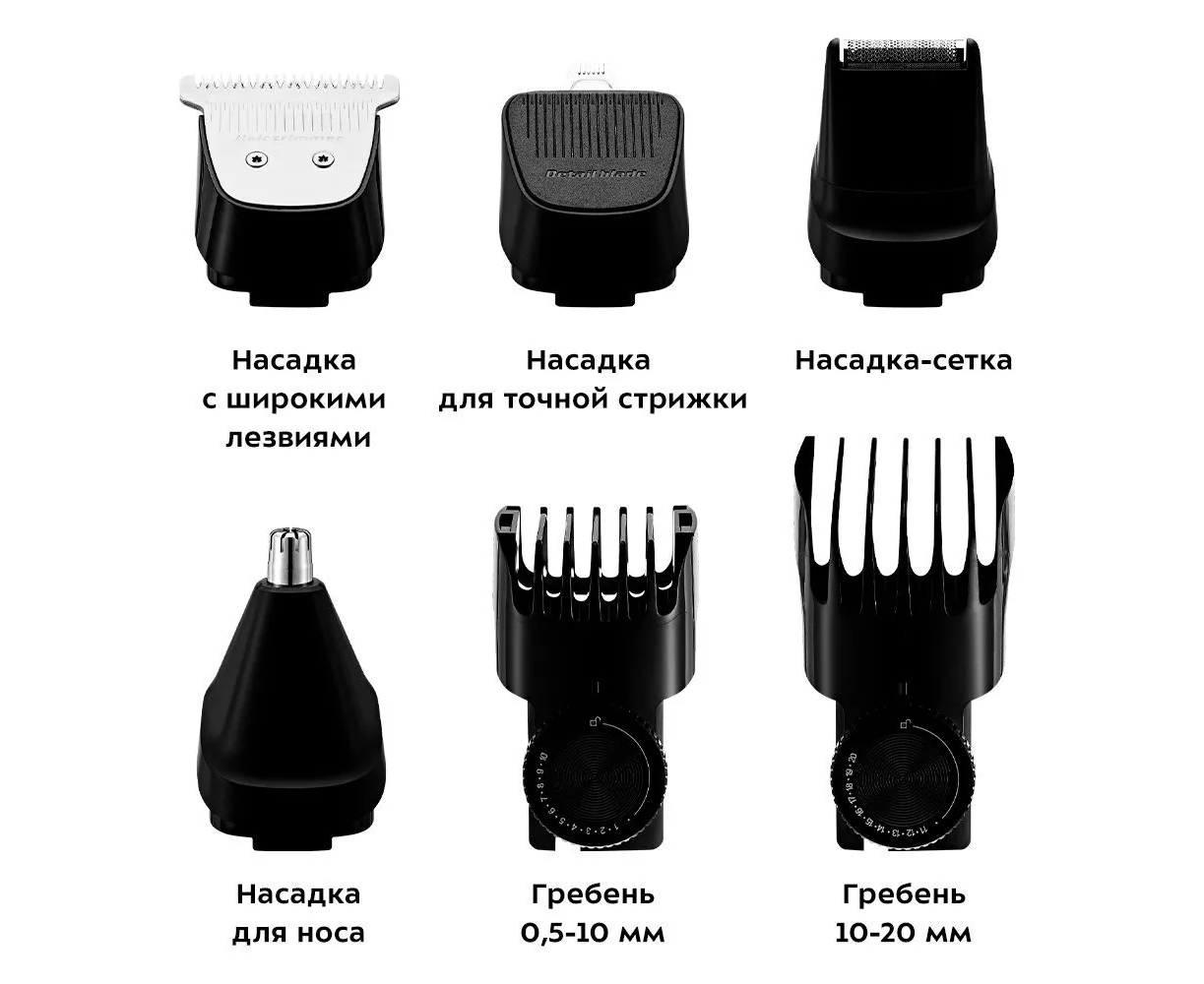 Насадка для точной стрижки удобна для подравнивания бровей или усов. Насадкой с широкими лезвиями с гребнем можно стричь волосы на голове. Насадка-сетка предназначена для бритья и подравнивания короткой щетины на лице.