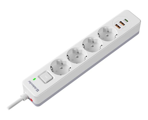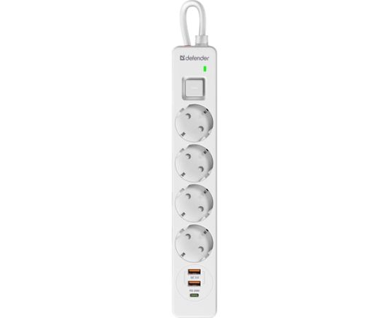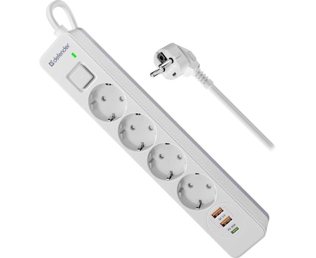Удлинитель DEFENDER с сетевым фильтром DFS 143 3 м, белый, 4розетки, USB+TypeC (99434)