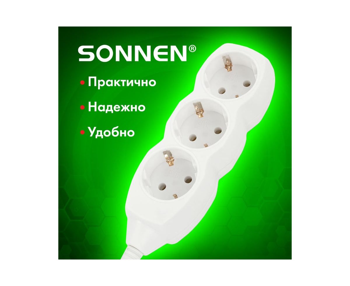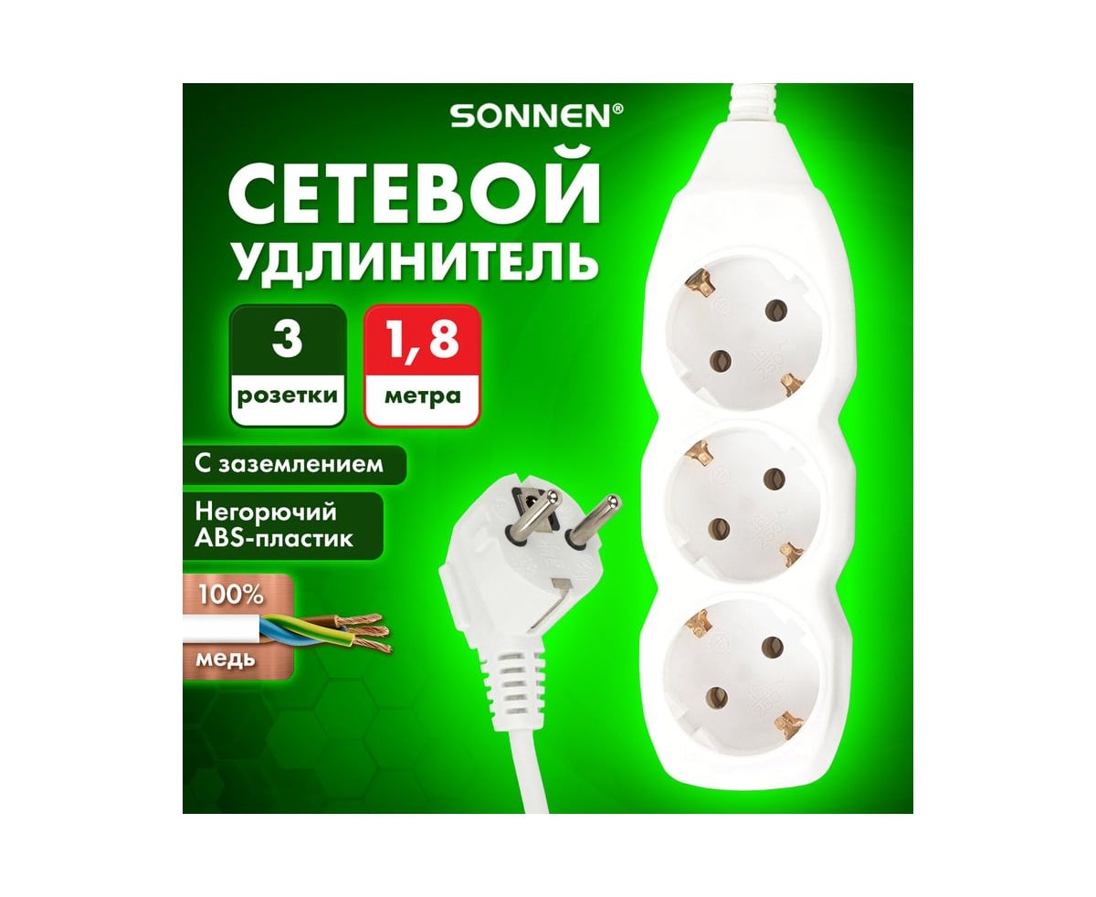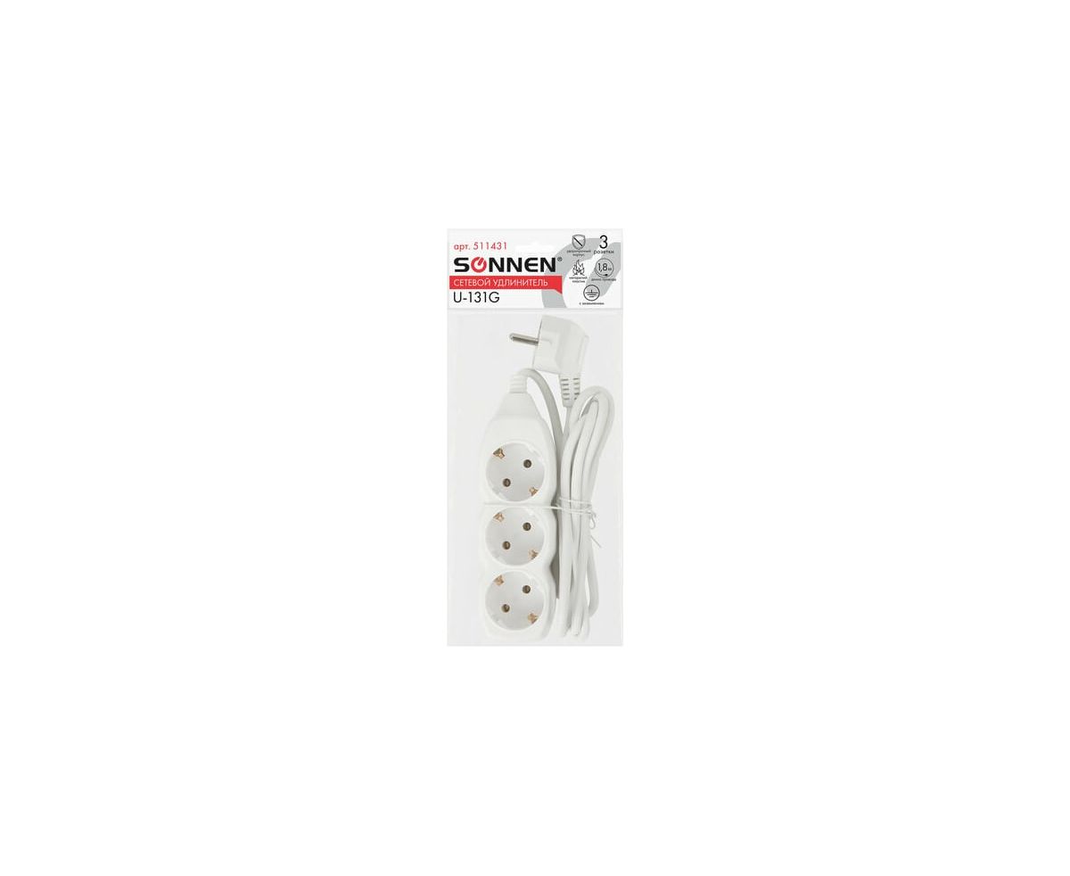 Удлинитель сетевой SONNEN U-131G (511431) 3 розетки, c заземлением, 10А, 1,8м, белый