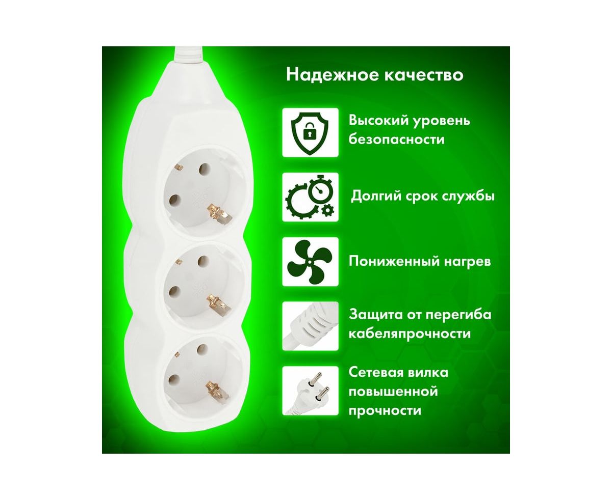 Сетевой удлинитель оснащен 3 евророзетками с заземлением. Максимальный ток нагрузки подключенных устройств может достигать 10 А. В сочетании эти параметры позволяют безопасно подключать к удлинителю до 3 электроприборов.