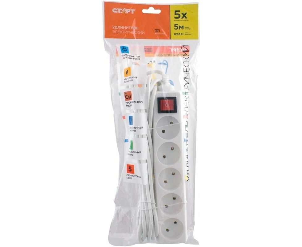 Удлинитель СТАРТ 4670012297772 5 розеток. с/у S 5x5 - V. Заземления нет. Кнопка включения. Длина провода 5,0 м.