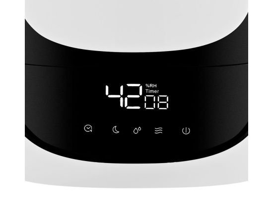Вы можете задавать желаемый уровень влажности от 40 до 90% с шагом 5%, а также время работы увлажнителя - от 1 до 12 ч с шагом 1 ч. На дисплее отображаются текущая влажность и таймер. Вы можете выключить дисплей, воспользовавшись кнопкой “Ночной режим”.