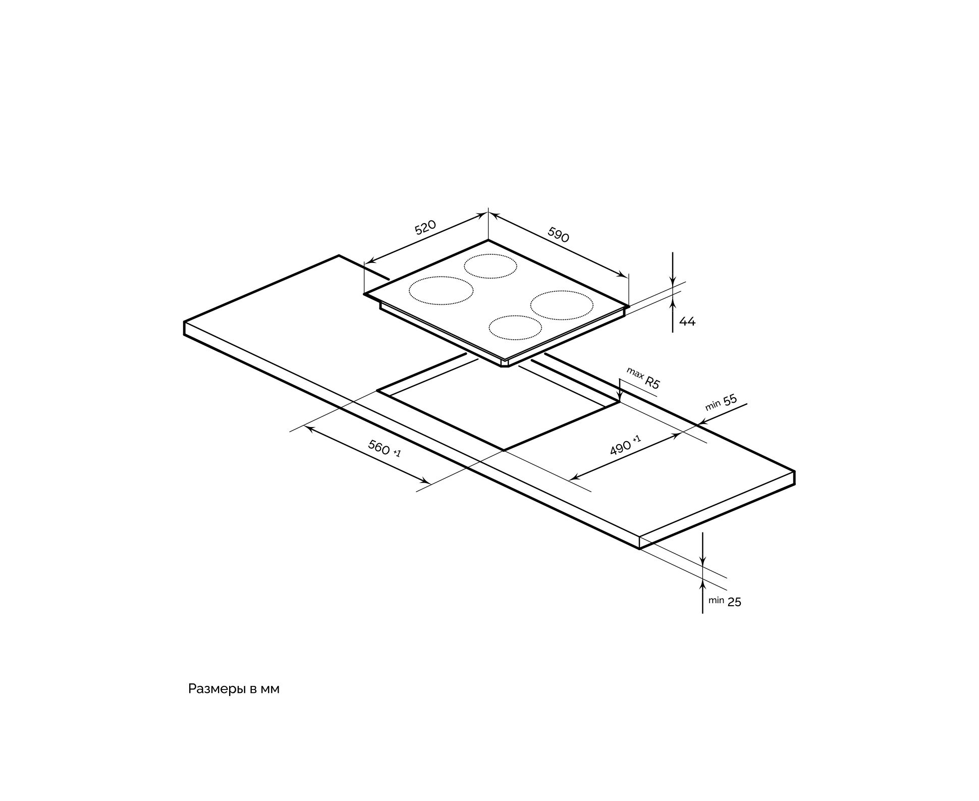 Размер для встраивания 560х490 мм