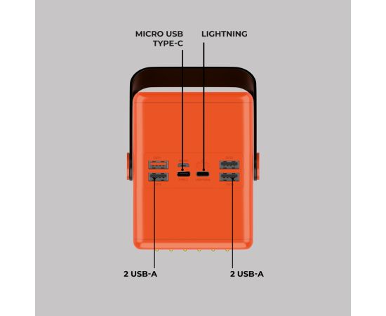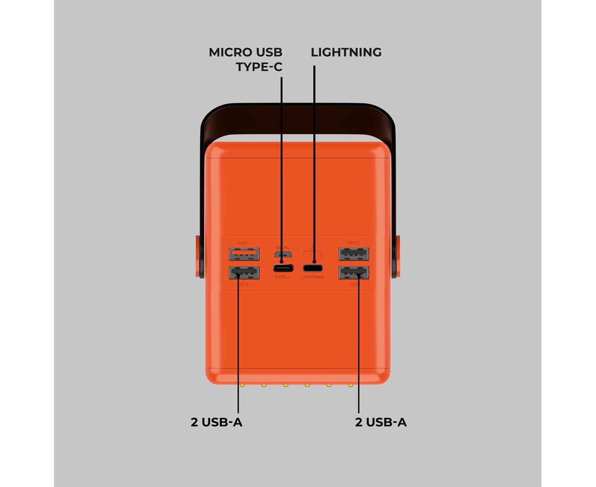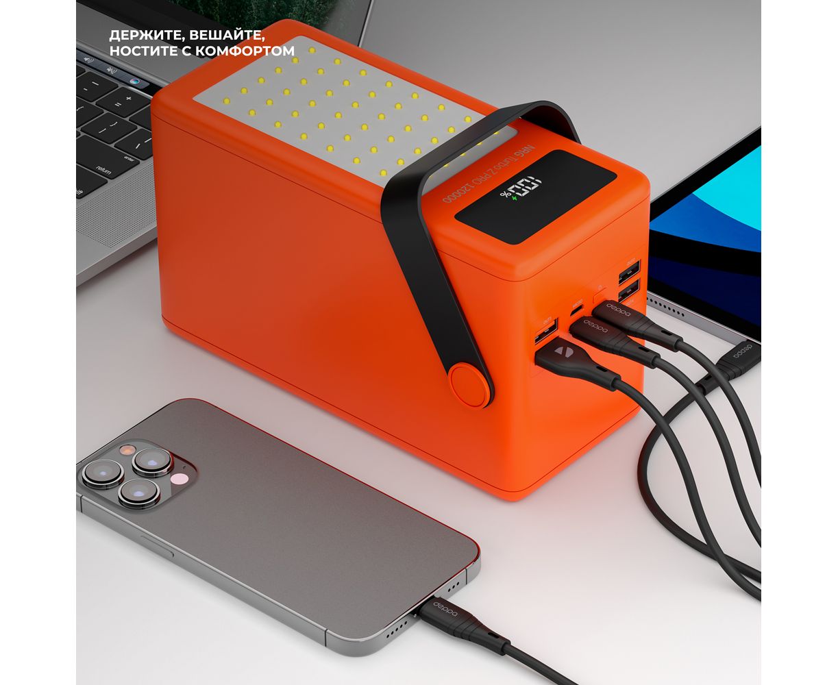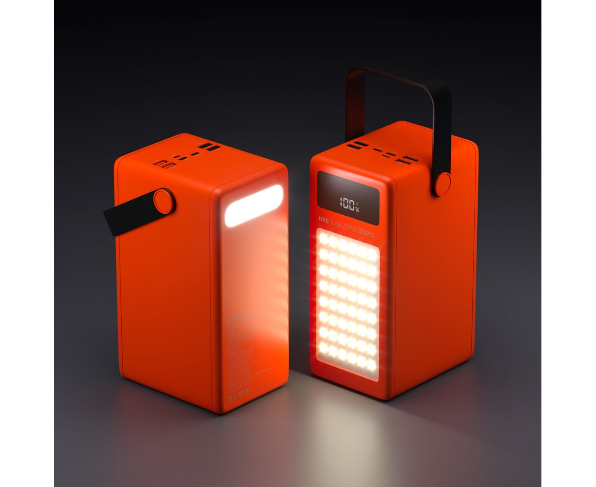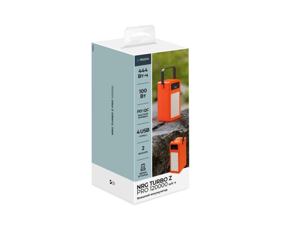 Мощный внешний Аккумулятор NRG Turbo Z PRO на 120 000 mAh от Deppa с общей мощностью до 100 Вт быстро зарядит все ваши устройства, в том числе ноутбук. Вы всегда сможете отследить уровень заряда на LED-дисплее, а с помощью ручки аккумулятор комфортно вешать на разные уровни и носить с собой. Кроме того, пауэрбанк поддерживает протоколы быстрой зарядки Power Delivery и Quick Charge и имеет один Type-C выход и четыре USB выхода, а также входы с разъёмами Type-C, Micro USB и Lightning. Два мощных светодиодных фонаря станут помощниками в походных условиях, а яркий контрастный цвет будет заметен на любой местности.