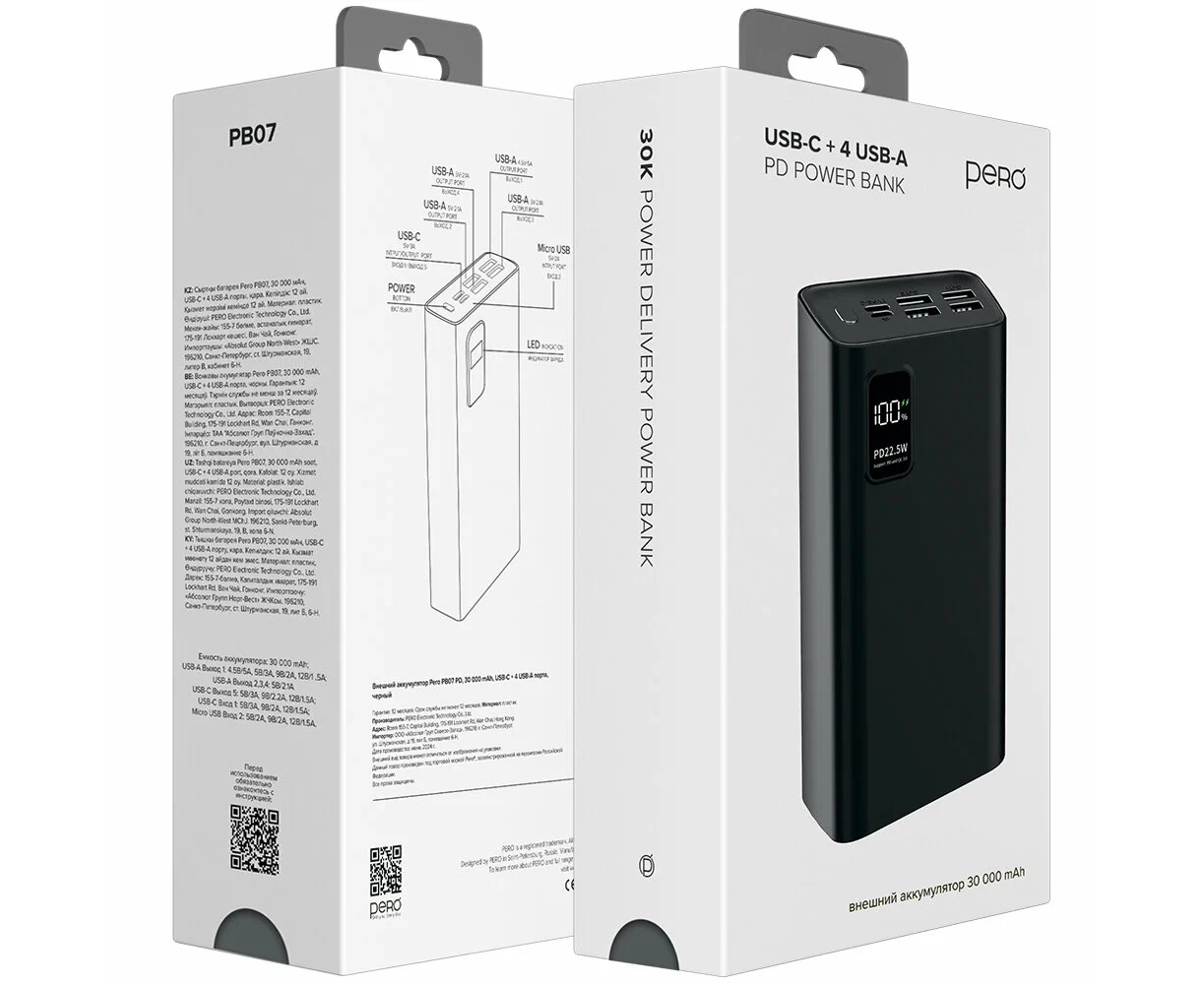 Внешний аккумулятор PERO PB07 30000mAh, Li-Pol, output USB-C + 4 USB-A черный