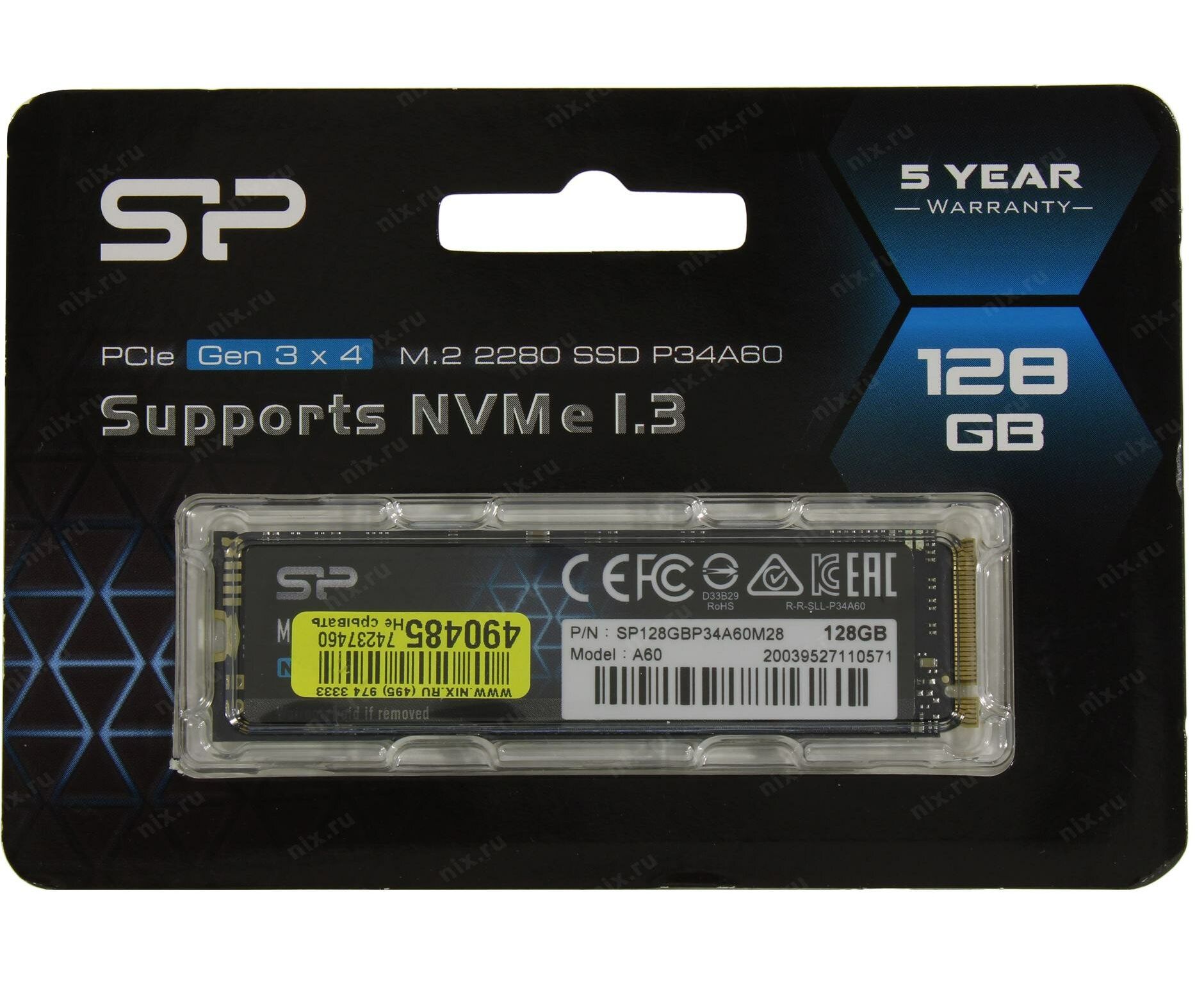 Внутренний SSD Silicon Power 128GB P34A60, PCIe 3x4, R/W - 2200/1600 MB/s, (M.2), 2280, TLC 3D NAND