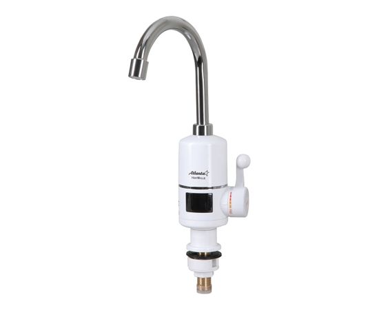 Водонагреватель Atlanta ATH-7421 поставляется в сборе с краном. Его устанавливают на раковину и пользуются им, как обычным сантехническим изделием. Рычажок для включения находится непосредственно на рабочем блоке, оборудованном тэном. При включении воды автоматически активируется нагрев, никаких дополнительных кнопок нажимать не придется.