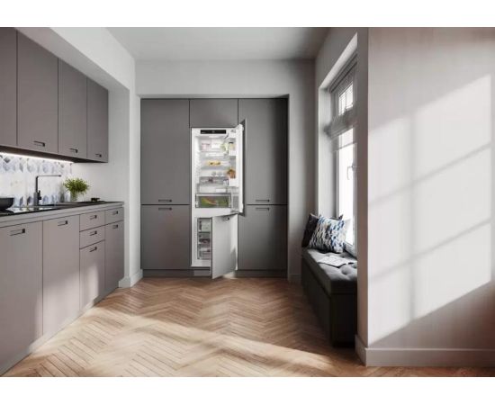 Встраиваемый холодильник Liebherr ICNd 5123 Plus высотой 177 см и полезным объемом 251 л. Внутри камера оснащена шестью полками, пять из которых регулируются по высоте, а одна разделяется. Контейнер EasyFresh обеспечивает более длительное хранение неупакованных овощей, фруктов и плодов, за счет плотно закрытой крышки и повышенной влажности. Сенсорное управление очень удобно и понятно, выбрать нужный режим можно в одно касание. Вы можете настроить ваше устройство и через приложение, после монтажа SmartDeviceBox, стандартные опции расширятся еще более удобными. IceCubeTimer во время вечеринки станет превращать воду в кубики льда с повышенной скоростью. HolidayMode сэкономит электроэнергию, но и не даст распространиться неприятным запахам. Режим BottleTimer активирует функцию SuperFrost и при достижении продуктом нужной температуры на приложение приходит уведомление.