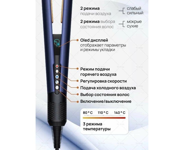 Три предустановленные температуры — 80°C, 110°C и 140°C — позволяют выбрать оптимальный режим для различных типов волос.
