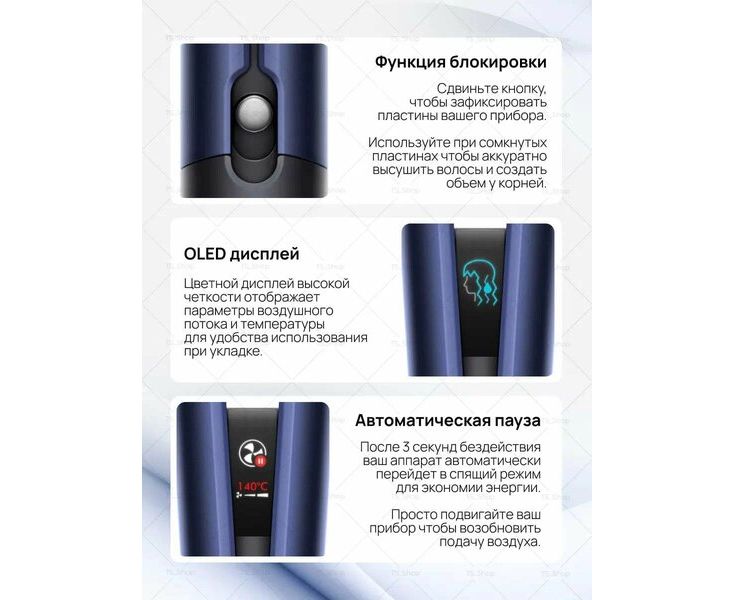 Функция блокировки позволяет удобно предварительно высушить волосы и создать объём от корней.