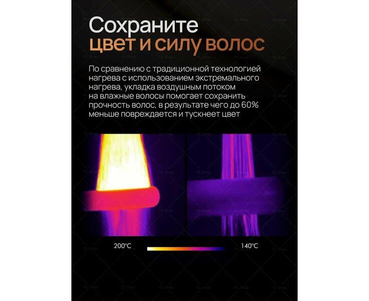 Интеллектуальный контроль тепла регулирует температуру воздушного потока до 16 раз в секунду, предотвращая чрезмерное тепловое повреждение и защищая естественный блеск волос.