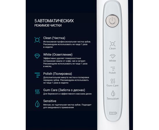 Особенности: 5 Режимов работы: Sensitive/Clean/White/Polish/Gum Care: режим Clean: 41000 пульсаций/мин, режим White: 48000 пульсаций/мин, режим Polish: 45000 пульсаций/мин, режим Gum care: 35000 пульсаций/мин, режим Sensitive: 31000 пульсаций/мин.
